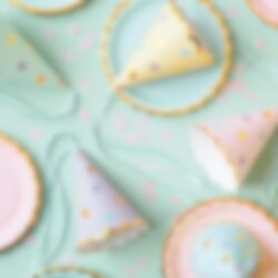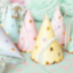 6 st. otroligt tjusiga kalashattar i vackra pastellfärger med guldfolierade kanter och med motiv av stjärnor och band i fina färger. En kul detalj att ha med till dukningen till varje kalas eller fest.