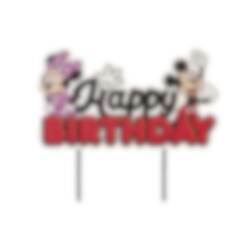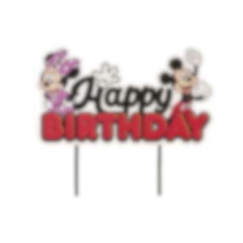 Cake Topper av papp med texten "Happy Birthday" och charmiga motiv av Musse och Mimmi Pigg. Höjd ca 14,5 cm.