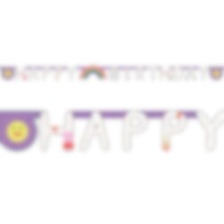 Girlang av papp i lila färg med den vita texten "Happy Birthday", samt med färgglada detaljer och roliga Peppa Pig motiv på båda sidor. En fint komplement att dekorera kalasrummet med när det är kalasdags. Girlangen är ca 2,5 meter lång.