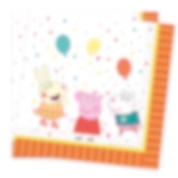16 st. servetter med orangea och gula kanter, vit bakgrund och med motiv av Peppa Pig och hennes vänner Rebecca Rabbit och Suzy Sheep samt färgglada ballonger och konfetti. Servetterna är 2-lagers och är ca 33 x 33 cm stora utvikta.