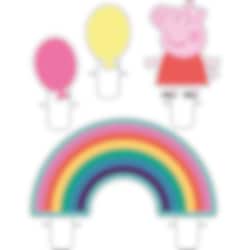 4 st. tårtljus som föreställer Peppa Pig, 2 st. ballonger i färgerna gul och rosa och en vacker regnbåge från TV-serien Peppa Pig. Tjusiga att dekorera tårtan med när det är dags för Peppa Pig kalas. 3 st. av ljusen är ca 4,5 cm höga och ett tårtljus är ca 9 x 3 cm stor.