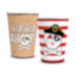 Duka upp till ett fartfyllt piratkalas med dessa festliga pappmuggar i klassiskt pirattema. Muggarna har två olika motiv, ett med texten "Hip Hip Ahoy!" på en bakgrund som liknar en skattkarta och ett med dödskalle, pirathatt och röda ränder, vilket gör dem till en snygg och lekfull detalj på kalasbordet.