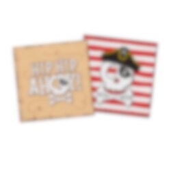 Duka upp till ett riktigt härligt piratkalas med dessa festliga servetter i klassiskt pirattema. Servetterna har två olika motiv, ett med texten "Hip Hip Ahoy!" på en bakgrund som för tankarna till en gammal skattkarta och ett med dödskalle, pirathatt och röda ränder, vilket gör dem till en snygg detalj på kalasbordet.