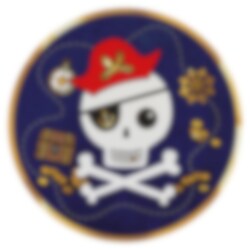 8 st. papptallrikar som har motiv av en Jolly Roger som är omringad av piratrelaterade saker i guldfärg. Duka fram dessa tallrikar till de små sjörövarna när det är dags för ett piratkalas.