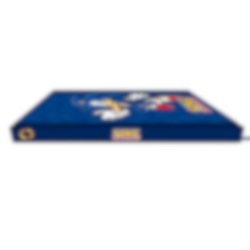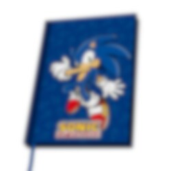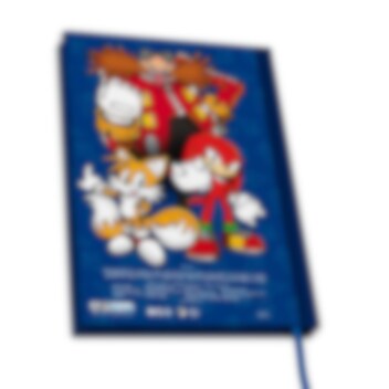 Tjusig anteckningsbok i blå färg med motiv av Sonic på framsidan och på baksidan av Tails, Knuckles och Doctor Robotnik, alla från det ikoniska spelserien Sonic the Hedgehog från SEGA.