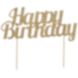 Tårtdekoration med texten "Happy Birthday" i en glittrande guldfärg. Dekorera tårtan med denna när det vankas födelsedagskalas för att göra tårtan extra tjusig. Dekorationen är ca 10 x 14 cm stor.