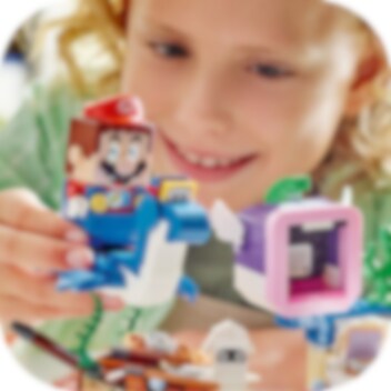 Sök efter skatter i undervattensvärlden! Rid på en Dorrie med LEGO® Mario, LEGO® Luigi eller LEGO® Peach (figurer ingår inte) och utforska skeppsvraket. Åh nej! Skattkistan är låst, så du måste hitta nyckeln. Titta under skeppets mast, men bli inte uppäten av Cheep Chomp! Snurra på plattformen för att öppna snäckan och avslöja ett nyckelblock. Öppna skattkistan och hämta juvelen!