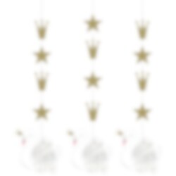 3 st. hängande dekorationer med motiv av vita svanar samt stjärnor och kronor i guld. En passande dekoration att hänga upp inför kalaset med Stylish Swan tema. Dekorationerna är ca 91 cm långa medan motiven är ca 18 cm stora.