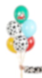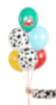 Förpackningen innehåller 2 st. vita ballonger med motiv av svarta kofläckar, 1 st. gul ballong, 1 st. röd ballong, 1 st. ljusblå ballong och 1 st. turkos ballong med motiv av en röd traktor.