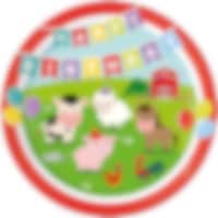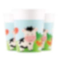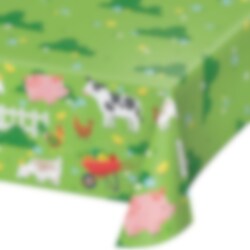 En grön bordsduk av papper med motiv av fina bondgårdsdjur. Bordsduken är 137 x 259 cm.
