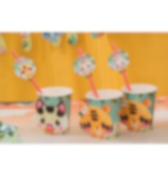 Gör barnkalaset ännu härligare med dessa färgsprakande pappmuggar från Bangoberry. De glada djurvännerna från ön Bingo Bango pryder varje mugg och får drycken att smaka lite extra festligt. Den lekfulla designen med lätt 3D-effekt väcker figurerna till liv och skapar ett fantasifullt inslag på kalasbordet.