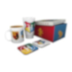 Förpackningen inkluderar en porslinsmugg, ett dricksglas och 2 st. glasunderlägg som levereras i en unik presentlåda.