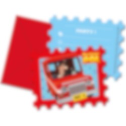 6 st. formade inbjudningskort med kul motiv från Postis Per. Korten är 8 x 10 stora och förpackningen inkluderar även 6 st. röda kuvert.