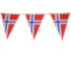 En snygg flaggirlang med tryck av dom norska flaggorna i färgen rött, vitt och blått. Flaggorna är triangelformade vimplar och det är tryck på båda sidorna. Girlangen är 3,6 meter lång och varje vimpel är ca 23 cm stora. Tjusiga att hänga upp över festbordet, på väggen eller varför inte ute på ett träd om solen skiner och det ska pyntas inför Norges nationaldag. Girlangen är gjord av papp och snöret den hänger på är gjord av genomskinlig plast.