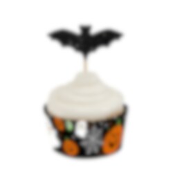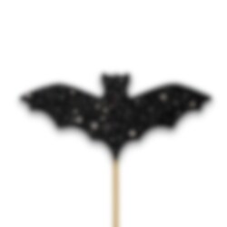 12 st. cake toppers med svarta glittrande fladdermöss. Fladdermössen är tillverkade av papp, sitter på en pinne av trä och är 8 cm höga.