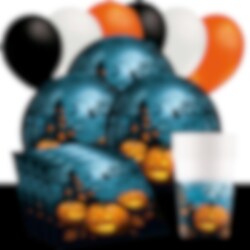 Detta färdiga kalaspaket till Halloween inkluderar tallrikar (23 cm), pappmuggar (200 ml) och servetter (33 x 33 cm) för 8 eller 16 personer, utöver det så ingår 15 st ballonger i vit, orange och svart färg samt en svart bordsduk av plast (137 x 274 cm).