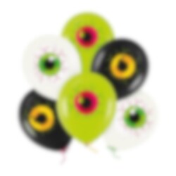 Ge Halloweenkalaset en lekfull och rolig touch med dessa färgglada latexballonger. Setet innehåller sex ballonger med olika tryckta ögon, perfekta för att sätta rätt stämning. Ballongerna kan fyllas med helium eller luft och passar både inomhus och utomhus.