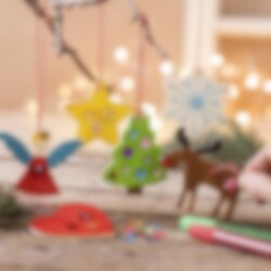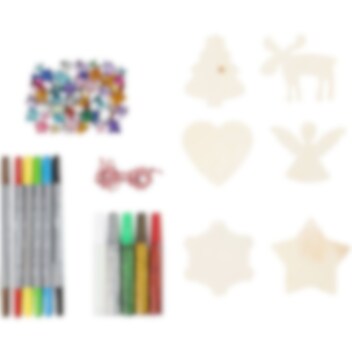 Skapa egna färgglada juldekorationer med detta kreativa pysselkit! Här kan barnen måla och dekorera fina julfigurer i trä – som granar, hjärtan, stjärnor och renar. Använd glitterlim, strass och tuschpennor för att ge varje dekoration en personlig touch.