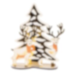 Vacker bordsdekoration som blänker i guld. Dekorationen är uppbyggd av speglar i plast som föreställer ett par renar och en julgran. Juldekorationen är 20 cm hög.