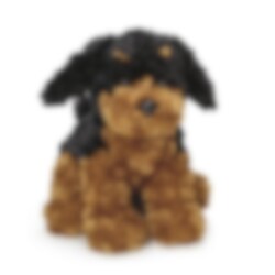 Gullig gosedjurshund med mjuk och lockig päls i svart och brun färg. Hunden är 25 cm hög och kan tvättas i 40 grader. Godkänd och CE märkt enligt EN71.