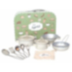 Kökset med 5 st. olika köksredskap samt 2 st. grytor, 1 st. stekjärn,1 st. durkslag och 1 st. grytvante. Allt snyggt förpackat i en väska i papp. Väskan kan vändas och användas som spishäll då där finns 2 st. kokplattor.