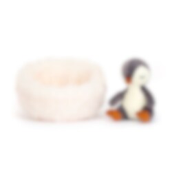 Pingviner går oftast inte i ide på vintern, men denna lilla sömntuta gör saker på sitt eget sätt och har skapat ett fluffigt och mysigt vitt näste eller bo som är perfekt att sova bort vinterns isiga stormvindar i. Den älskar att ligga mysigt inbäddad i sitt luddiga bo och drömma sig bort, men har ingenting emot att slumra även utanför boet. Denna gosiga sötnos till mini pingvin, med sin gräddvita mage, varmt grå päls, blundande ögon, lena fötter samt näbb i mörkt orange och sitt permanent fridfulla uttryck vet hur man håller sig härligt varm och utsövd. En bra kompis att ha vid läggdags om du har svårt att komma till ro. Tillverkad av 98% polyester, 2% spandex och handtvättas vid behov.