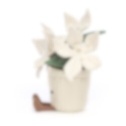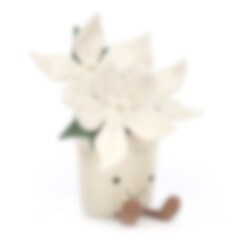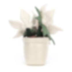 En kul och elegant dekoration eller mjuk leksak i form av 3 vita julstjärnor med detaljer i guld, planterade i en kawaii-inspirerad glittrig kruka med ett glatt leende och små ben. Denna mjuka och gosiga krukväxt kan användas som en vacker dekoration till jul eller på skrivbordet, en som inte behöver vattnas och klarar av att vältas av till exempel kataloger, djur eller barn. Annars kan julstjärnan helt enkelt användas som en annorlunda mjuk leksak med snygga detaljer. Tillverkad av 90% polyester, 10% bomull och handtvättas samt hängtorkas vid behov.