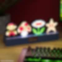 Denna dekorativa lampa är 30 cm bred och pryds av tre klassiska power-ups från Super Mario™ – Super Mushroom, Super Star och Fire Flower – arrangerade snyggt på en bas. Tänd lampan och se dessa legendariska ikoner lysa upp! Lampan har också en fasande ljusfunktion där ikonerna tänds en i taget samt ett musikreaktivt läge som synkroniserar ljuset med ljud.