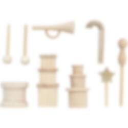 Setet innehåller små klassiska julföremål som trumma med trumpinnar, presenter, trumpet, käpp, feststav och stjärna, allt i naturligt trä som kan målas och dekoreras för att passa nissens stil.