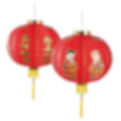 Fira det kinesiska nyåret med denna runda kinesiska lykta på 40 cm i diameter. Den är röd med asiatiska tecken och traditionella figurer på båda sidor, samt har guldtrådar. Lyktan är gjord av papper och passar perfekt för att hänga upp både inomhus och utomhus.