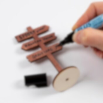 Vart i hela världen är du på väg? Denna lilla skylt av trä kan guida dig till både Nordpolen och Mexiko. Montera ihop den med lim så är den klar att använda – men du kan också välja att dekorera den. Du kan alltid färglägga skylten med vår hobbyfärg Plus Color som har god opacitet. Men kom ihåg att om du vill dekorera skylten med en tunn ogenomskinlig tuschpenna måste du först måla den så att färgen inte rinner ut i träet..