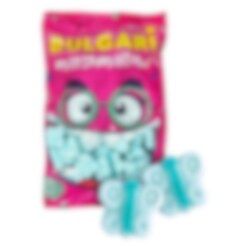 Ingredienser: Socker, glukos-fruktossirap, vatten, gelningsmedel: matgelatin, aromer, färg: E133; majsstärkelse