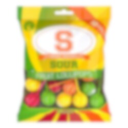 S-märke Sour Fruit Klubbor är en blandning av hårda klubbor med läckra fruktsmaker likt de klassiska s-märkena. Påsen inkluderar klubbor med smakerna: Hallon, citron, päron och ananas. Produkten är vegansk.