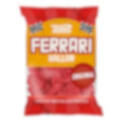 Vingummi med hallonsmak föreställande Ferraribilar från märket Pingvin.
