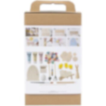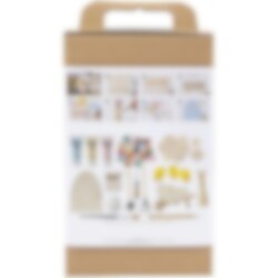 Setet innehåller allt du behöver för att bygga och dekorera, inklusive en trädörr, miniverktyg, små kycklingar, pastellfärg och dekorationer. Perfekt för barn och pysselälskare som vill skapa en unik påskdekoration!