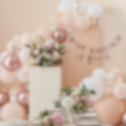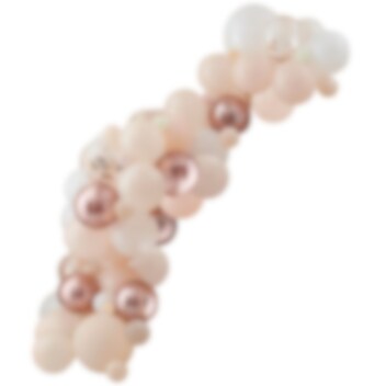 Fin ballongbåge i persika-, vit- och roséguldfärgade toner som du själv bygger ihop. En läcker dekoration som passar både till kalas, fester eller bröllop. Förpackningen innehåller hela 70 st. ballonger i olika storlekar och tillbehör. Ballongbågen är ca 4 meter lång.