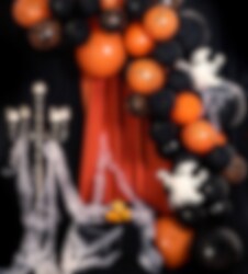 Supercool ballongbåge i svart och orangea färger som du själv bygger ihop. En snygg dekoration som passar till Halloween festen. Köp gärna till vårt spindelnät som du fäster på ballongbågen för extra läskig effekt. Förpackningen innehåller hela 55 st. ballonger i olika storlekar och tillbehör. Ballongbågen är ca 5 meter lång.