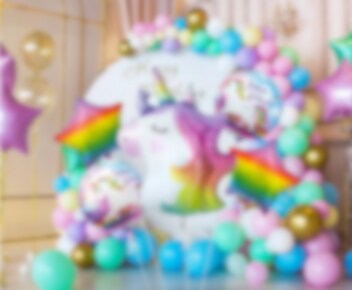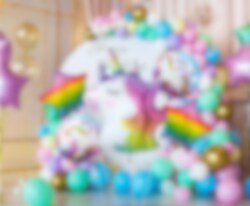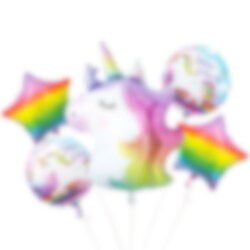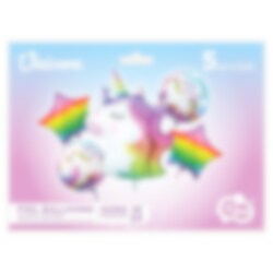 Söt ballongbukett med olika folieballonger i enhörningstema. Buketten består av en stor enhöringsballong, två runda ballonger med motiv av enhörningar, 35 cm och två stjärnformade ballonger i regnbågsfärger, 35 cm. Förutom ballongerna så ingår vitt ballongsnöre.