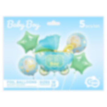 Läcker ballongbukett med olika folieballonger i blått babyshower-tema. Buketten består av en stor ballong formad som en barnvagn med texten Baby Boy, 55 cm, två runda ballonger med texten It's a boy, 35 cm och två hjärtformade mintgröna ballonger, 35 cm. Förutom ballongerna så ingår vitt ballongsnöre.