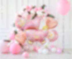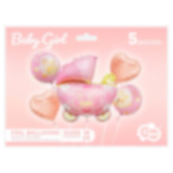 Underbar ballongbukett med olika folieballonger i rosa babyshower-tema. Buketten består av en stor ballong formad som en barnvagn med texten Baby Girl, 55 cm, två runda ballonger med texten It's a girl, 35 cm och två hjärtformade ballonger i roseguld, 35 cm. Förutom ballongerna så ingår vitt ballongsnöre.