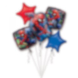 Häftig bukett av folieballonger i Spiderman tema. Lämpar sig bäst att blåsa upp med helium men fungerar med vanlig luft fast då får ballongerna hängas upp istället för att sväva. Innehåller en stor formad ballong, ca 70 cm hög, 2 st. fyrkantiga ballonger med motiv, ca 45 x 45 cm stora och så 2 st. stjärnformade ballonger i röd och blå färg.