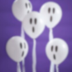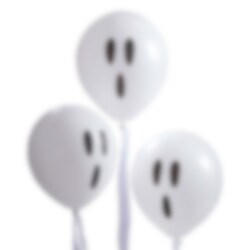 10 st. vita ballonger med motiv av spökansikten och vita streamers. Ballongerna blir ca 30 cm i diameter uppblåsta och blåses lättast upp med helium eller luft. En rulle med 10 meter streamers som man själv klipper till den längden man önskar.