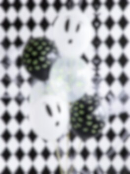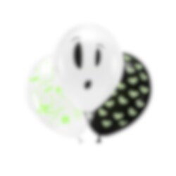 Det här setet med tre latexballonger passar perfekt till halloweenkalaset och bjuder på extra effekt när ljuset släcks. Ballongerna har olika mönster, bland annat fladdermöss och spöken, där vissa delar lyser i mörkret efter att ha exponerats för ljus. En rolig och stämningsfull detalj som garanterat fångar både barnens och de vuxnas uppmärksamhet!