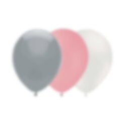 15 st. latexballonger i färgkombinationen grå, rosa och vit med 5 st. ballonger av varje färg.