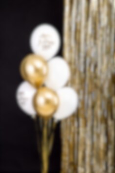 Vacker ballongbukett i färgerna guld och vit som du kan dekorera rummet med för en fin effekt inför varje kalas eller fest. Förpackningen inkluderar 2 st. vita ballonger, 2 st. guldfolierade ballonger och 2 st. vita ballonger med motiv av texten "Happy Birthday to You" samt stjärnor i guldfärg. Alla ballonger är ca 30 cm i diameter uppblåsta och kan blåsas upp med helium eller vanlig luft, vi rekommenderar att du använder en ballongpump.