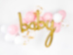 Tjusig folieballong i guldfärg som bildar ordet "baby". Ett perfekt tillbehör att ha med till Babyshowern. Ballongen blir ca 73 x 75 cm stor uppblåst och blåses lättast upp med vanlig luft.