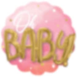 Folieballong i en rosa färg med 3D motiv av texten "Oh Baby" i vitt och guld. En imponerande dekoration till babyshowern. Ballongen är ca 71 cm i diameter uppblåst och blåses lättast upp med luft eller helium.