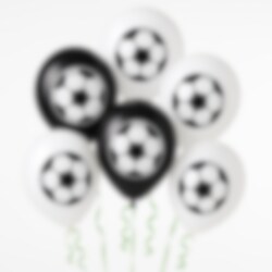 8 st. latexballonger i färgerna svart och vit samt med motiv av fotbollar. En självklar dekoration till varje fotbollskalas. Ballongerna blir ca 30 cm i diameter när de är uppblåsta och blåses lättast upp med helium.
