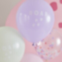 Förpackningen inkluderar 3 st. latexballonger i färgerna rosa, lila och pastellgrön med motiv av fotavtryck av en dinosaurie samt texten "Roar" i vit färg och 2 st. transparenta ballonger fyllda med färgsprakande konfetti.