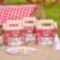 5 st. fina partyboxar som föreställer lador med bondgårdsdjur. Partyboxarna har pop out-dörrar och förpackningen kommer även med 15 st. ark med vita bokstäver som du kan använda till att anpassa partyboxarna till varje barn på kalaset.